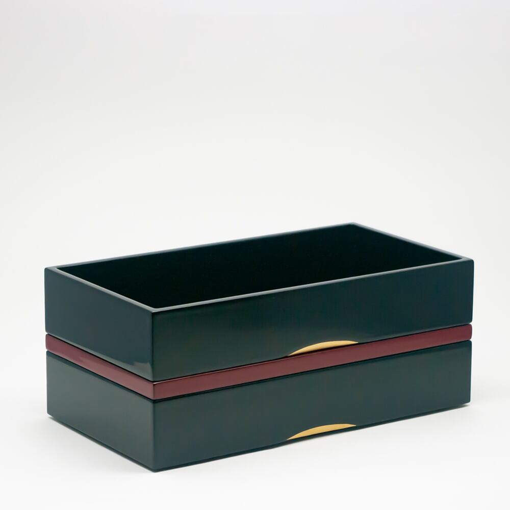 黒と朱のコントラストが鮮やかな三段重です。トレー無しでもスタッキング可能で、用途に応じて二段使いも出来る機能的な懐石重。和食に限らず洋食やサンドイッチなどの軽食を入れても特別感を演出してくれる器は、祝い事や行事だけでなく、ホームパーティーや普段のお食事でもお気軽に使っていただきたいお重箱です。